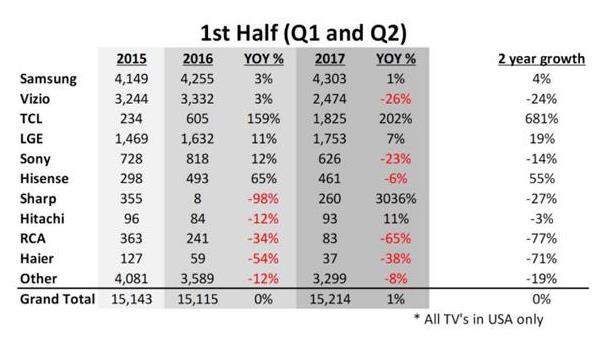 依据TCL半年报数据,电视事务方面,2017年上半年LCD电视(包含商用显现器)980.5万台,同比增加11.3%。其间智能网络电视销量615.8万台,同比增加36.7%。受益于品牌推行和途径拓宽,TCL北美商场增加微弱,销量同比大幅提高34.1%,接连三年被评为在美增加最快的电视品牌