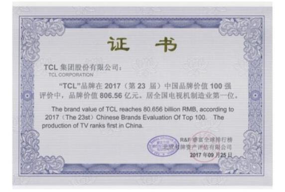 TCL当选2017我国品牌价值100强证书